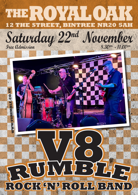 V8 Rumble Rockabilly Band hail from Norfolk, UK and feature the classic 3 piece rockabilly line-up of Slap Bass, Drums and Guitar. The band formed in the Norfolk town of North Walsham in 2006 and now gigs regularly around Norfolk events, pubs and clubs playing classic rock ānā roll and rockabilly songs & instrumentals, cover versions of more modern material played rockabilly style.